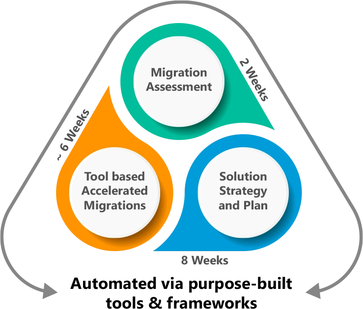 - The automated migrations allow for 30-60% direct effort and hence cost saving vs conventional methods.